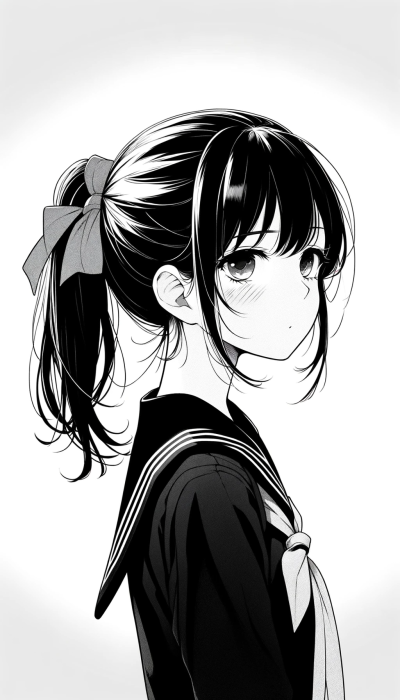 以下の条件で画像を生成してください。 ・黒髪ポニーテイルの女学生 ・青い瞳 ・黒のセーラー服とブルーリボンタイ ・憂いのある表情でこちらを見ている ・横向きポートレイト画像 ・白黒漫画調
